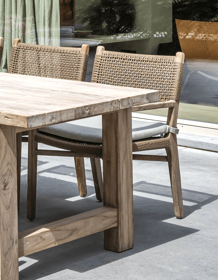 Het frame van alle modellen in de Fiona collectie Gommaire is vervaardigd uit premium teakhout. De natuurlijke grijstint geeft de stoelen een rustige, tijdloze uitstraling die prachtig past in zowel moderne als klassieke buitenomgevingen. Teakhout staat bekend om zijn uitzonderlijke duurzaamheid en natuurlijke bestendigheid tegen weer en wind, waardoor de Fiona collectie jaar na jaar zijn uitstraling en kwaliteit behoudt.