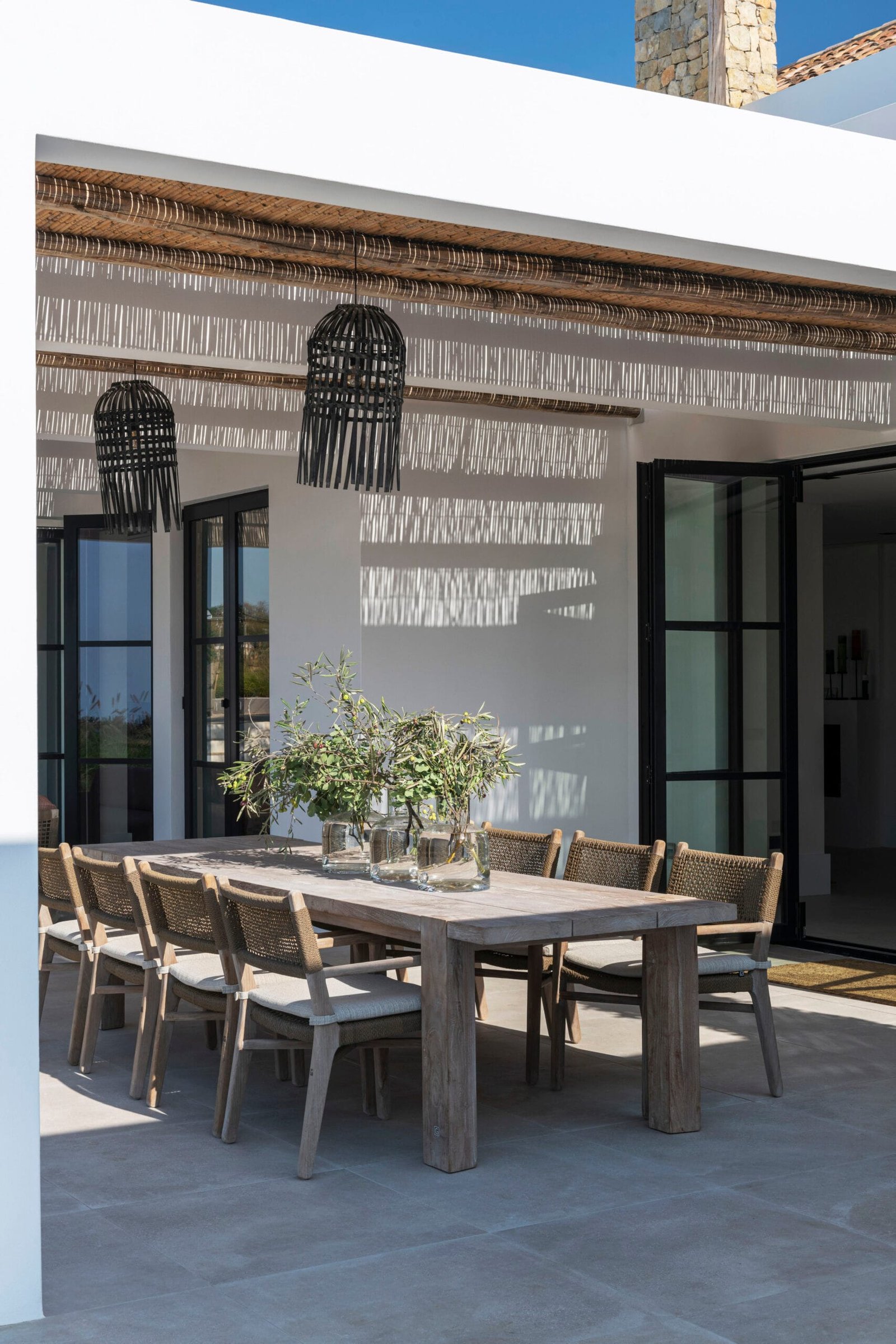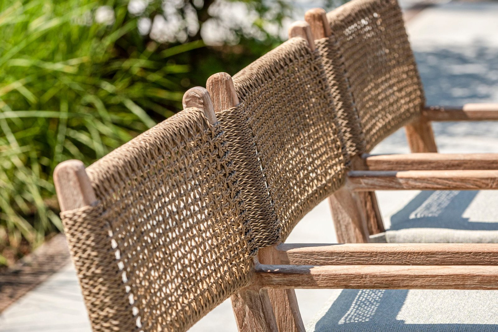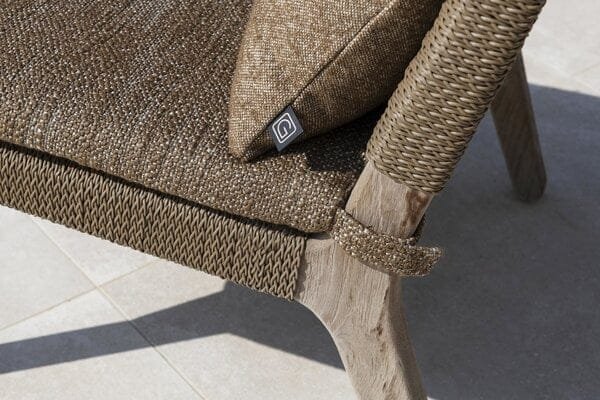 De rugleuning en zijkanten zijn verfijnd afgewerkt met PE wicker in de kleur ‘antique weed’. Dit materiaal biedt niet alleen een elegante structuur, maar is ook volledig weerbestendig. Het subtiele vlechtwerk versterkt de warme, organische look van de collectie en zorgt voor een comfortabele ondersteuning.