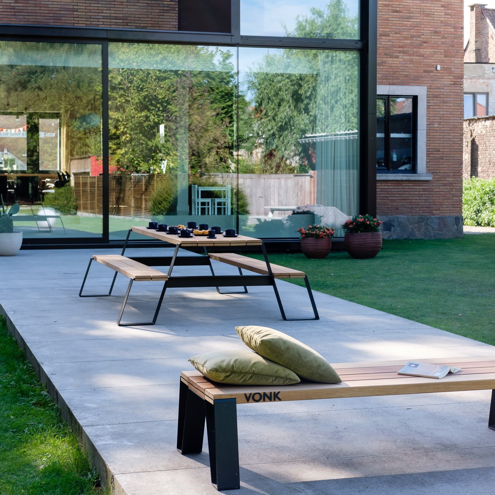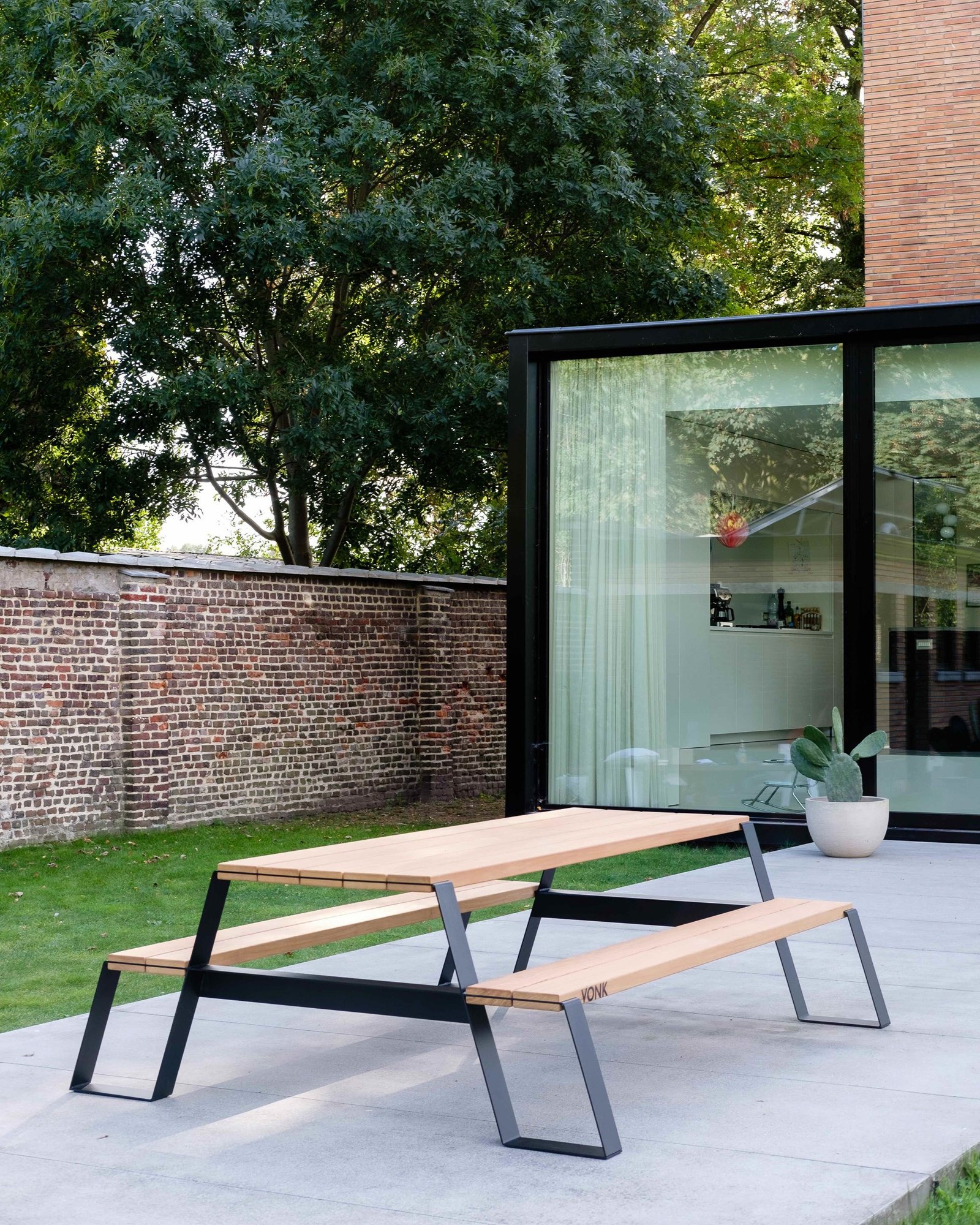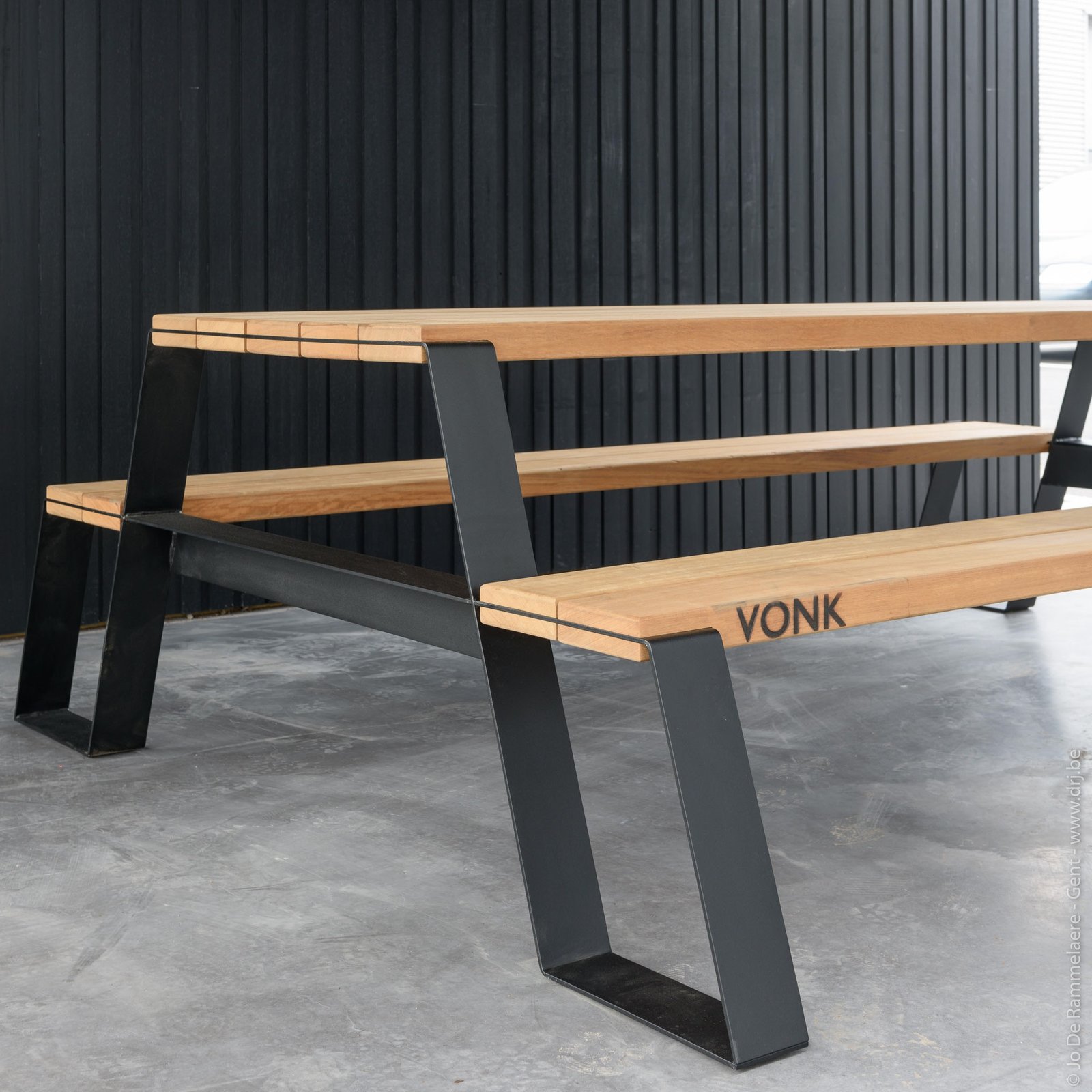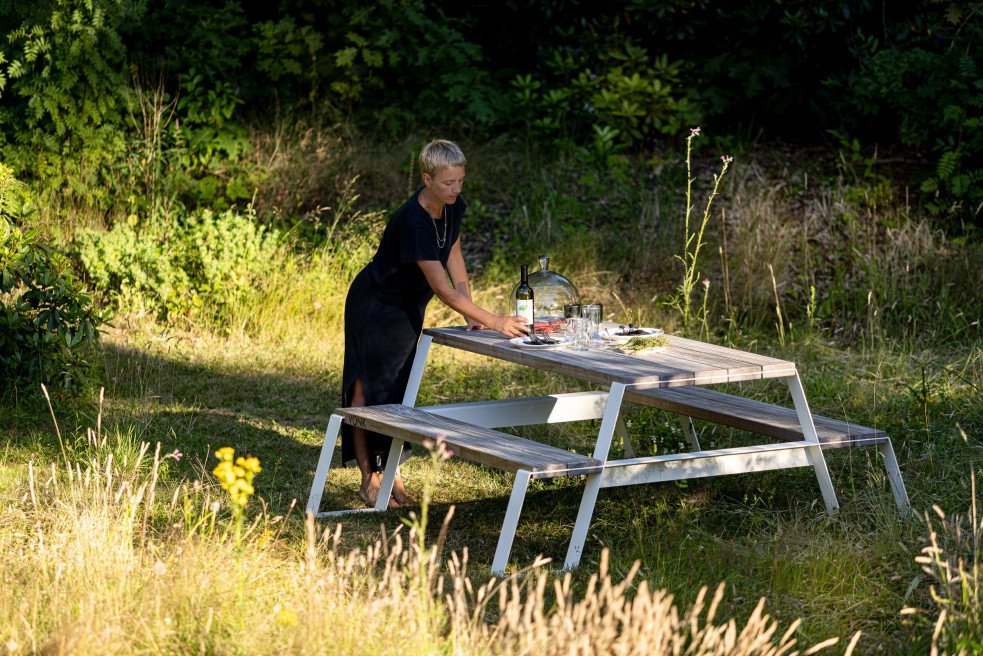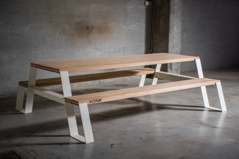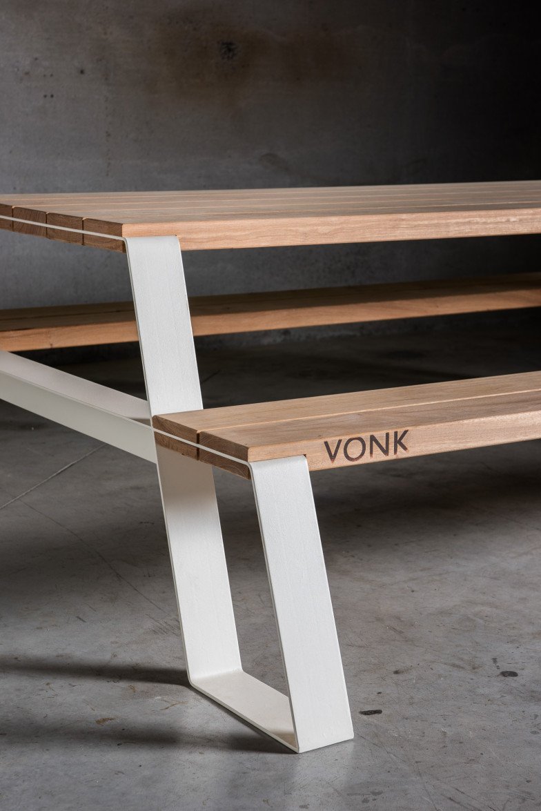 Met zijn sobere lijnen en robuuste karakter is de Fuse picknicktafel een toonbeeld van Belgisch design. De combinatie van massief hardhout en een stalen onderstel zorgt voor een duurzame constructie die bestand is tegen intensief gebruik en alle weersomstandigheden.