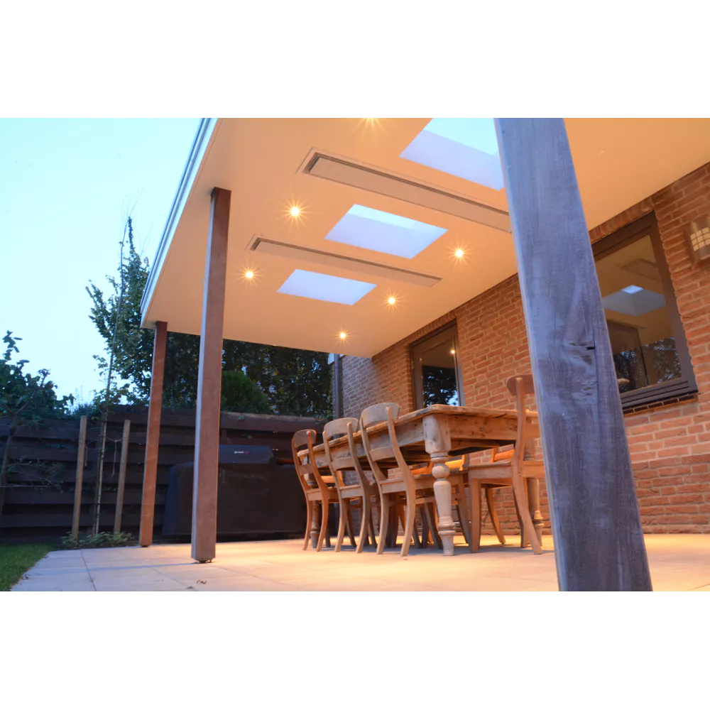 Dankzij het slanke profiel kan de Heatstrip Elegance discreet worden gemonteerd aan het plafond of aan de wand, onder een overkapping, veranda of pergola. Hierdoor blijft de buitenruimte open en visueel rustig, terwijl je toch geniet van een aangename warmte.