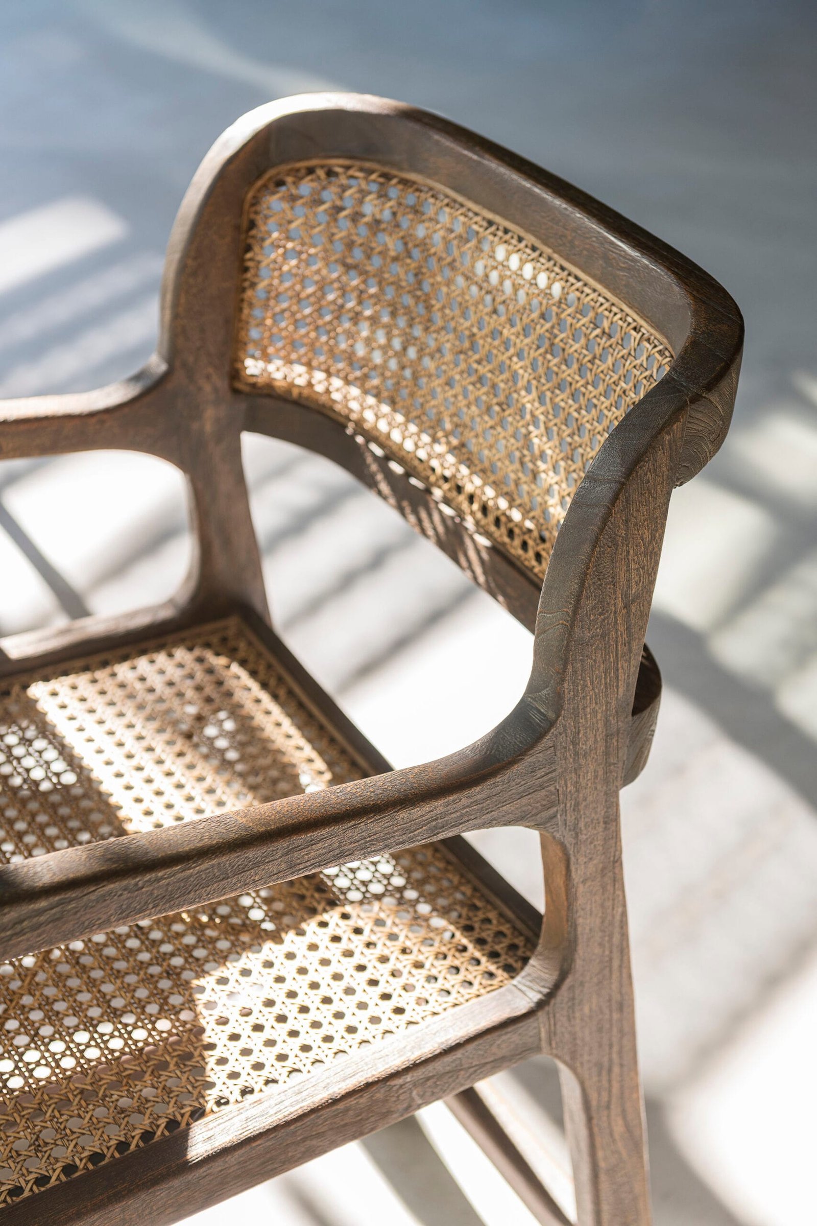 The chair has a subtle vintage Scandinavian look, but is distinguished by its unique rounded trapezoidal sides and the use of solid teak of exceptional quality.
