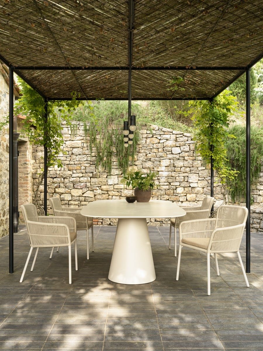 De wisselwerking tussen het zacht afgeronde tafelblad et le conische onderstel geeft de Sandro collectie haar unieke karakter. Het resultaat is een tijdloos maar uitgesproken ontwerp dat moeiteloos past in moderne tuinen, stedelijke terrassen en stijlvolle horecaconcepten.